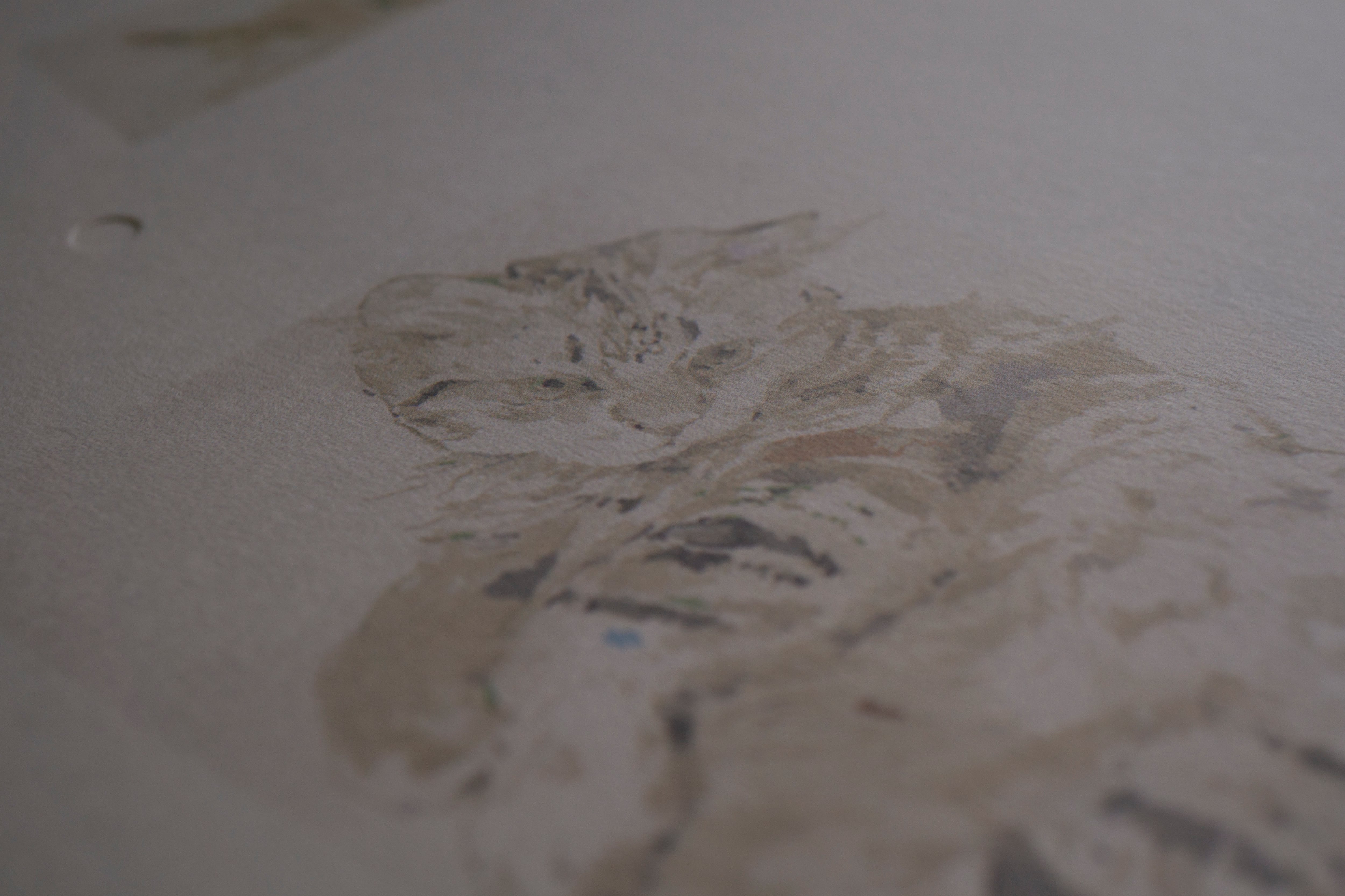 色彩は少し彩度を落とし、紙の風合いに馴染ませています。